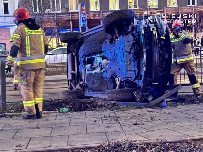Dachowanie na Pradze-Północ. Auto leży na boku na torowisku tramwajowym. Ruch zablokowany