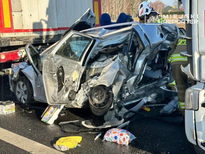 Skoda zmiażdżona przez dwie ciężarówki na DK50! W akcji śmigłowiec LPR