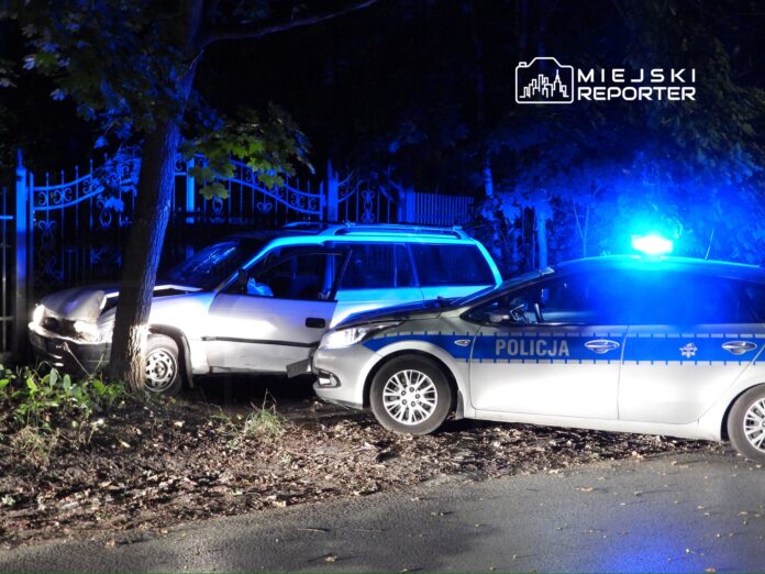 Nocny pościg na Białołęce. Kierujący uderzył w drzewo, uciekając pieszo zgubił klapki i biegł na bosaka. Radiowóz uderzył w drzwi auta