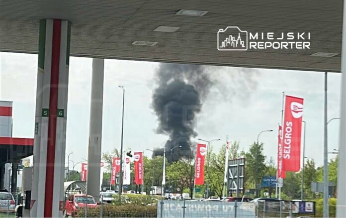 Duży pożar pod Warszawą. Kłęby czarnego dymu widziane z Warszawy. Na miejscu działa straż pożarna