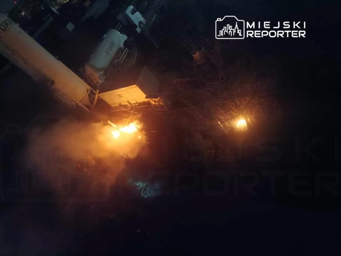 Nocna akcja straży pożarnej na Bemowie. “Wystąpiło iskrzenie z przewodu elektrycznego”. Zapaliła się trawa