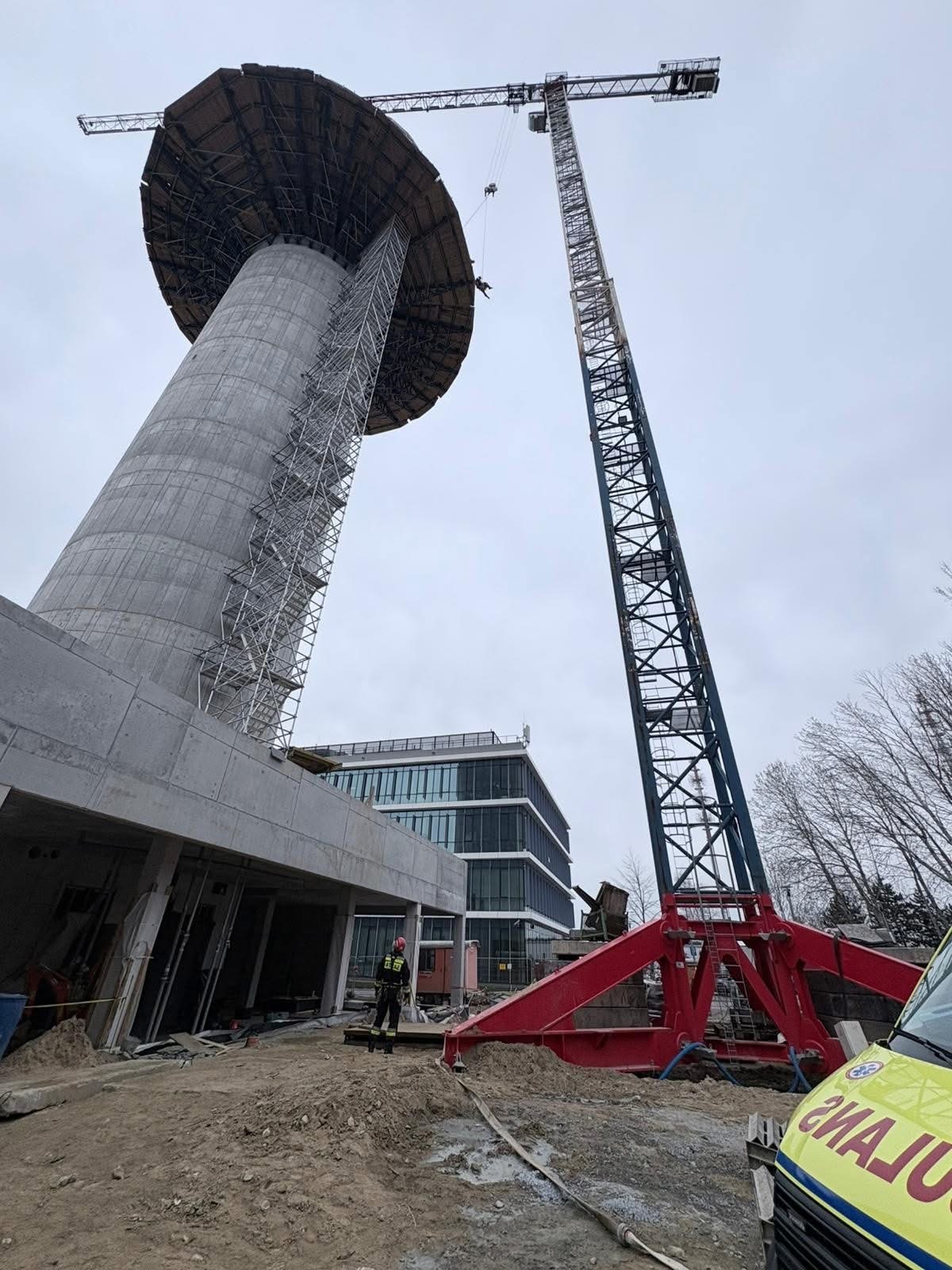 Zasłabł na budowie 50-metrowej wieży kontroli lotów na lotnisku Chopina. Strażacy sprowadzili go na dół