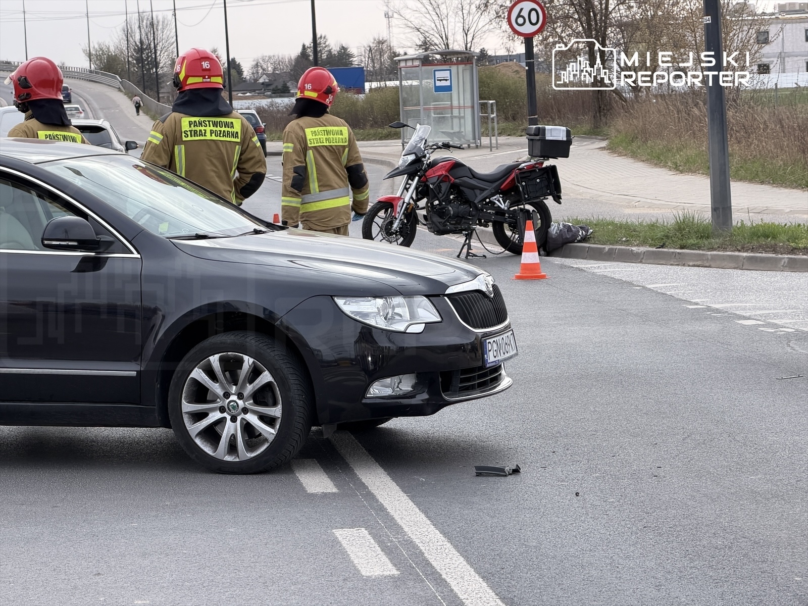 W trakcie manewru doszło do zajechania drogi kierującemu motocyklem marki Junak o pojemności 125 ccm. Po kontakcie pojazdów motocykl uderzył lewym kufrem w skręcający samochód, a następnie przewrócił się na jezdnię. Motocyklista odniósł obrażenia i został zabrany przez zespół ratownictwa medycznego do szpitala.