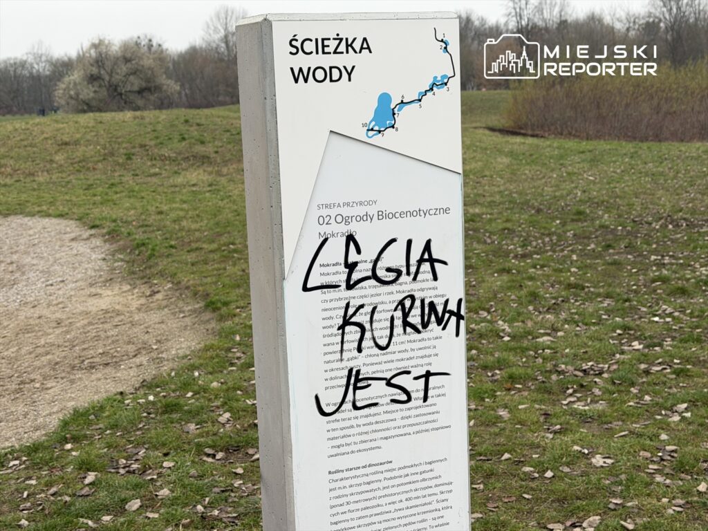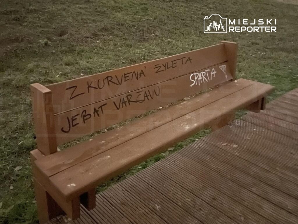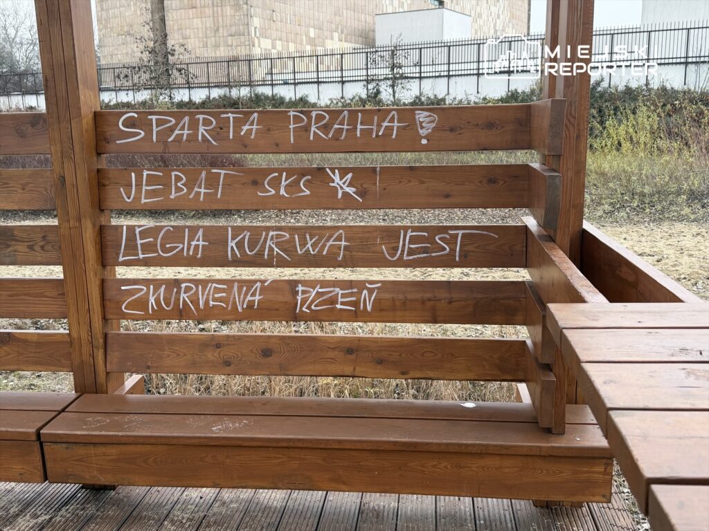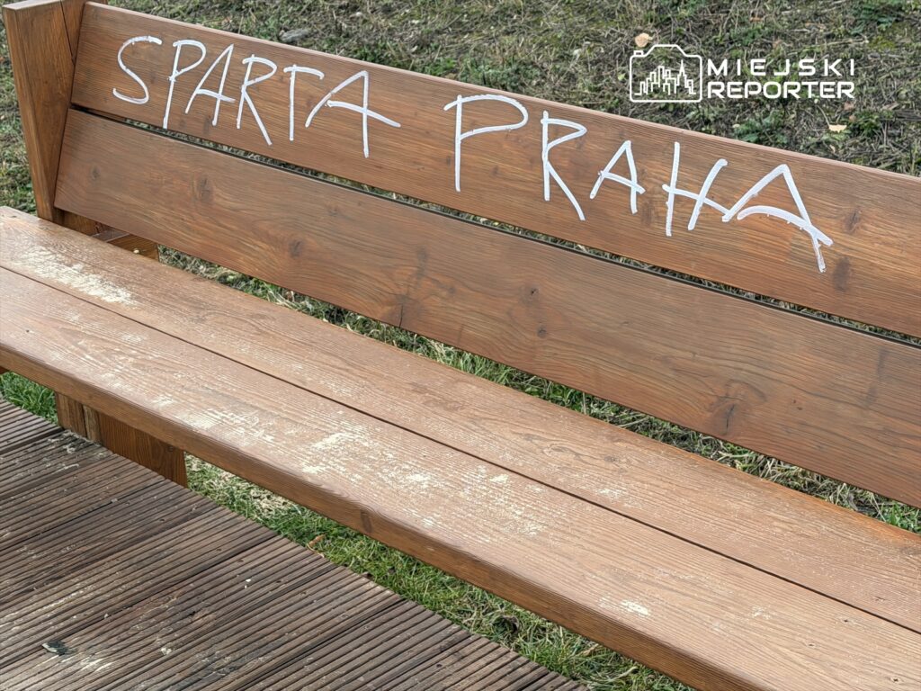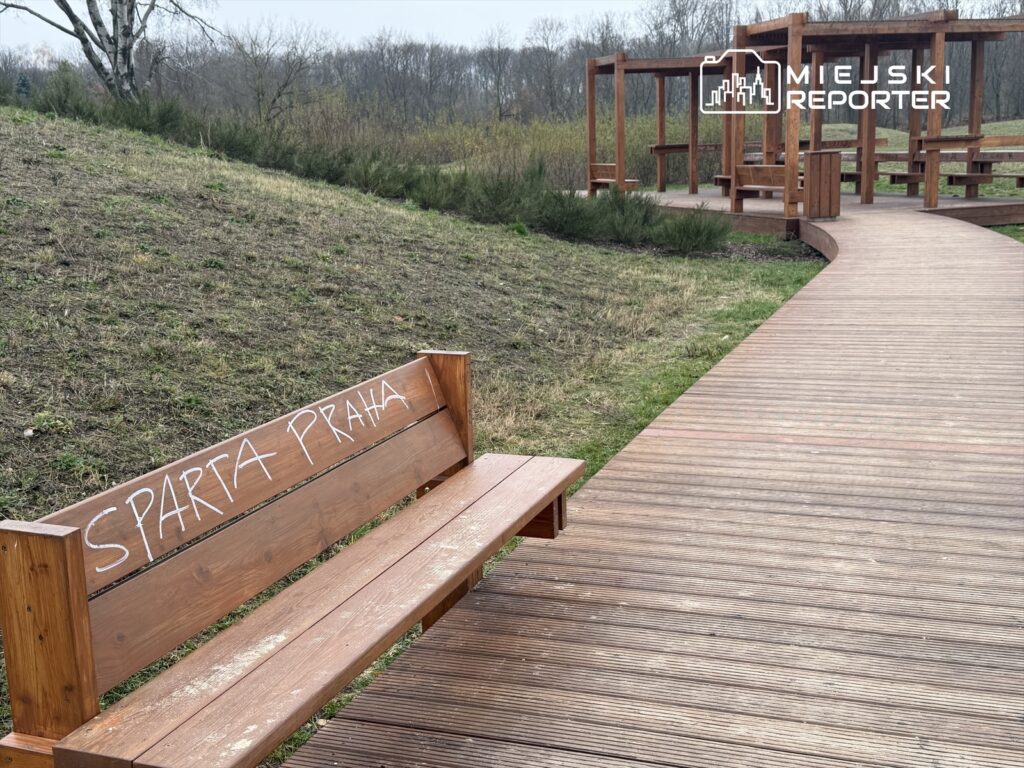 Według relacji naszej czytelniczki, to właśnie w czasie, gdy kibice gości przebywali w rejonie parku, doszło do zniszczenia elementów infrastruktury w Ogrodzie Biocenotycznym – jednym z najnowszych i najbardziej wrażliwych przyrodniczo fragmentów zrewitalizowanego Pola Mokotowskiego. Drewniane wyposażenie – pomosty, ławki, konstrukcje altan – zostało pokryte świeżymi, wykonanymi farbą i/lub mazakami napisami o wulgarnej treści oraz odwołującymi się bezpośrednio do środowiska kibicowskiego Sparty, w tym podpisami „Sparta Praha Ultras”.