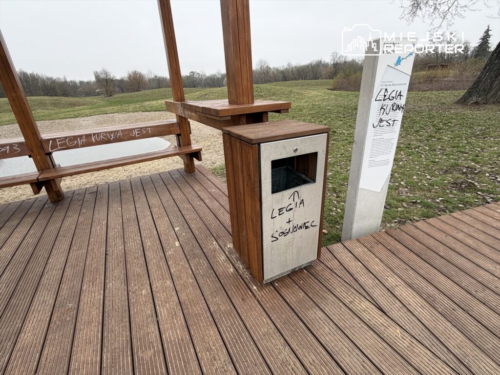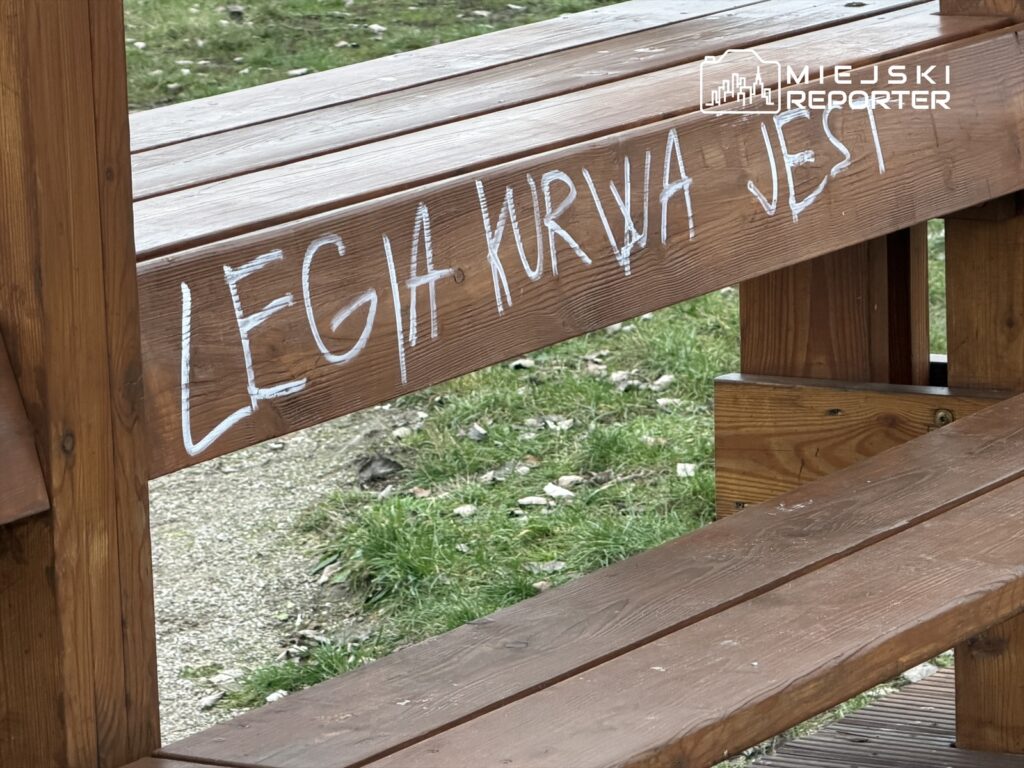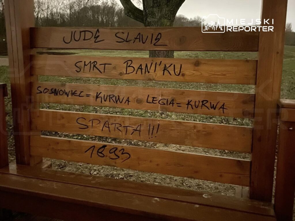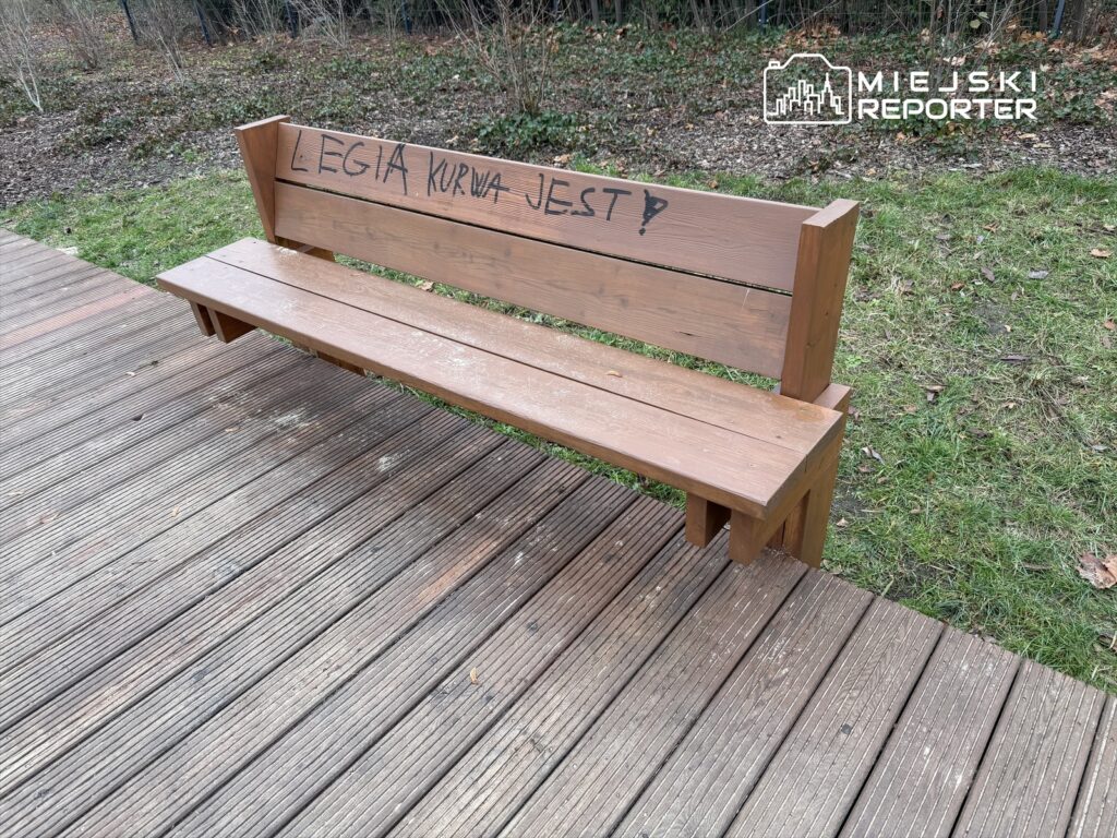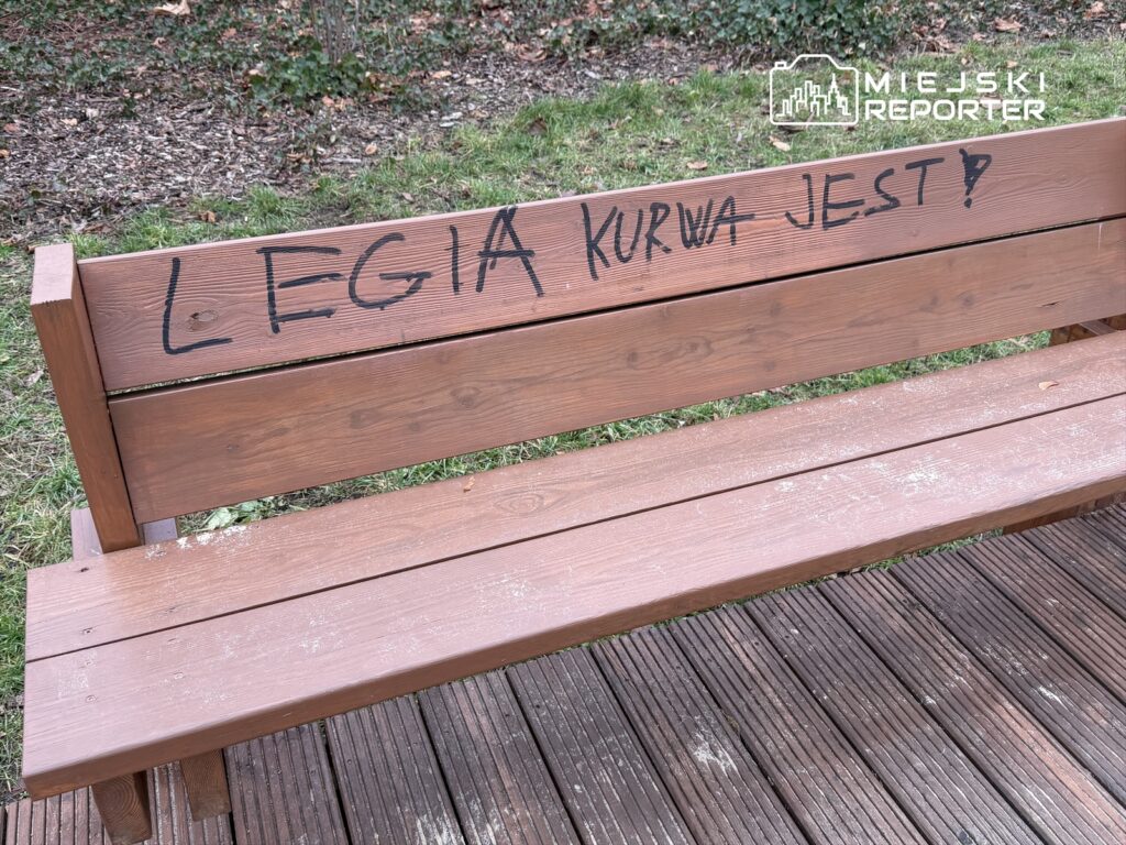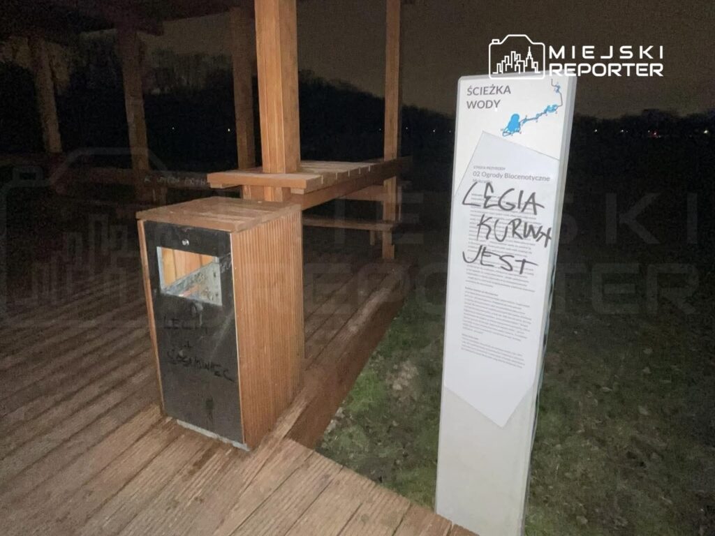 Według relacji naszej czytelniczki, to właśnie w czasie, gdy kibice gości przebywali w rejonie parku, doszło do zniszczenia elementów infrastruktury w Ogrodzie Biocenotycznym – jednym z najnowszych i najbardziej wrażliwych przyrodniczo fragmentów zrewitalizowanego Pola Mokotowskiego. Drewniane wyposażenie – pomosty, ławki, konstrukcje altan – zostało pokryte świeżymi, wykonanymi farbą i/lub mazakami napisami o wulgarnej treści oraz odwołującymi się bezpośrednio do środowiska kibicowskiego Sparty, w tym podpisami „Sparta Praha Ultras”.